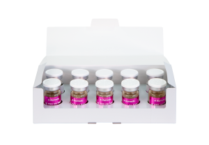 In fiool 1: exosomen uit de Centella Asiatica-plant en groeifactor Regecapil (P4aa), vitamines, aminozuren en mineralen samen met Acetyl s-Carrot Tetrapeptide-1 Amide (een slim bouwsteentje dat huid en haar beschermt.